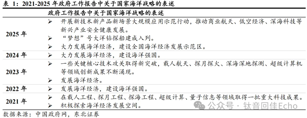 《2025年政府工作报告》提出“推动商业航天、低空经济、深海科技等新兴产业安全健康发展”,首次将“深海科技”列为战略性新兴产业。