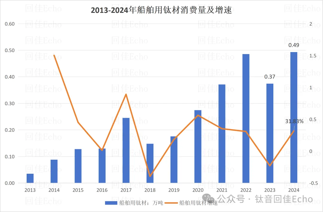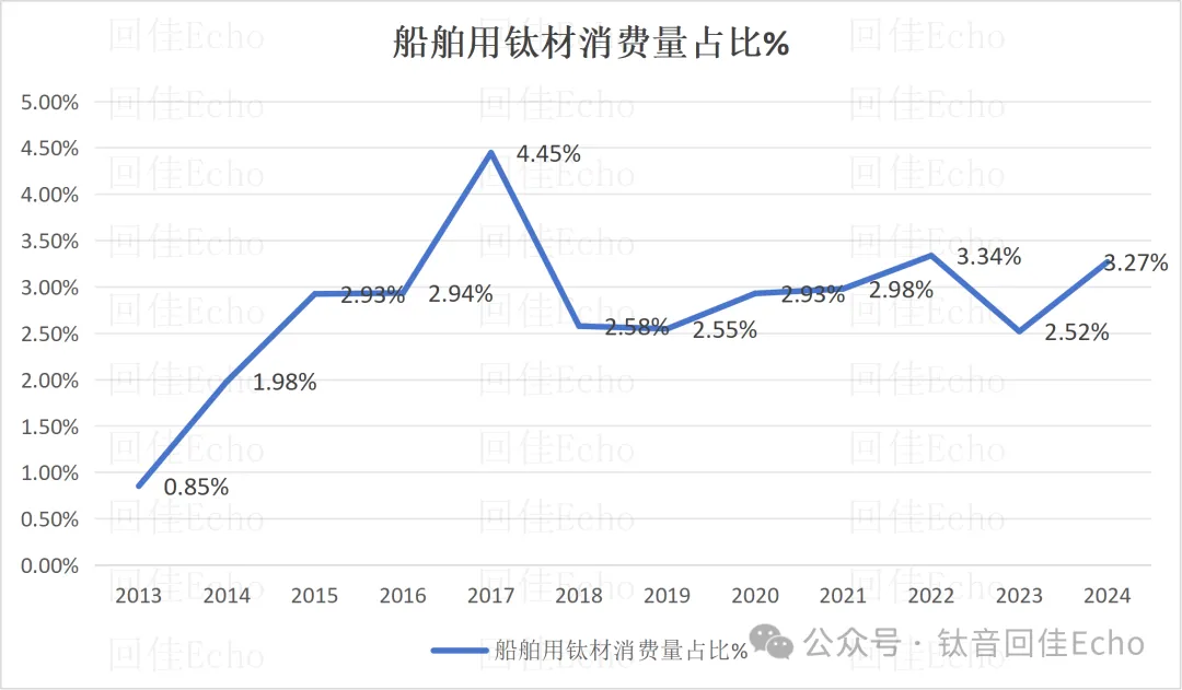 船舶用钛注重海水腐蚀环境下的经济性平衡。2024年我国钛材消费量15.09万吨,其中船舶用钛材消费量4933吨,占3.27%。从2013年的0.85%应用占比,增加到2024年的3.27%。整体来看,船舶用钛材消费量占比呈现增长趋势。