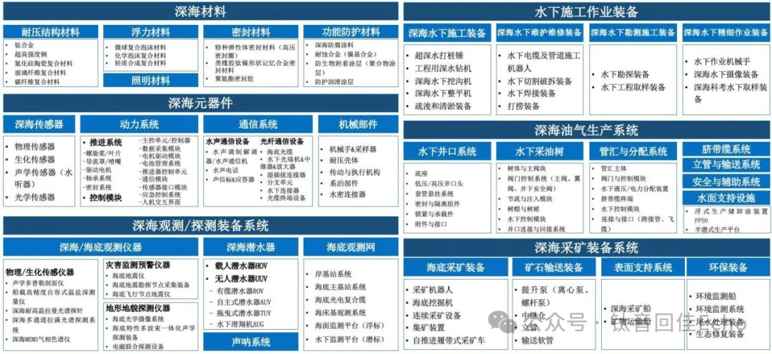 深海科技产业链分为上游基础材料与核心部件、中游装备制造与系统集成、下游资源开发与服务三大环节,形成从基础材料到终端应用的体系。
