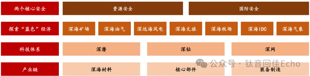 深海科技的发展对应着国家的资源与能源安全需求、国际竞争与技术突破、军民融合与战略安全,核心是要保障资源安全和国防安全,在此基础上探索海洋“蓝色”经济业态(例如深远海风电、深海文旅观光、深海牧场、深海IDC、深海气象服务等)。