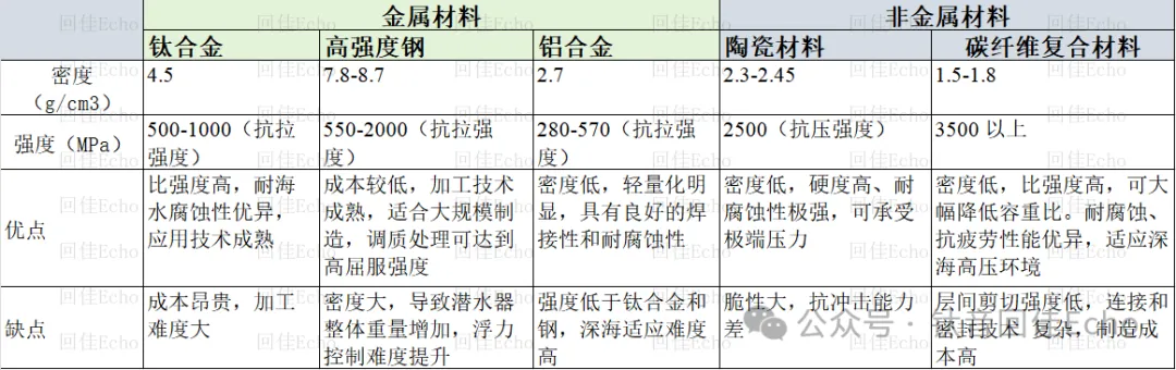 非金属材料中的复合材料,特别是陶瓷材料与碳纤维复合材料,凭借轻质高强、耐腐蚀性佳的特点受到关注。美国用石墨纤维增强环氧树脂材料成功制造出自动无人深潜器AUSSMOD2的耐压壳体,陶瓷的强度和弹性模量很高,且具有耐腐蚀、耐磨损、耐高温、电绝缘、非磁性和可透过辐射的优点,密度又比一般金属材料低,是很有发展潜力的高比强度材料。