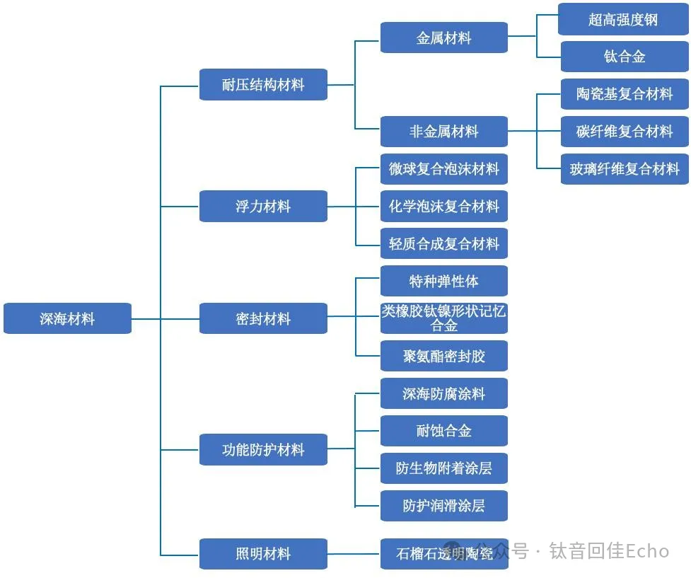 深海材料按其功能作用分类,分为耐压结构材料(壳体材料)、制造深潜器所用的浮力材料、密封材料、防护材料(如防腐材料、防护涂层、润滑材料 等)、照明材料等类别。按照材料性质,分为金属材料(超高强度钢、钛合金)、非金属材料(高分子复合材料、陶瓷基复合材料、碳纤维复合材料、玻璃纤维复合材料)等类别。