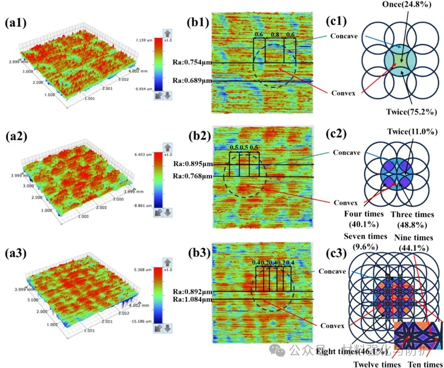重叠率主导表面完整性幅值,随重叠率升高,表面压应力幅值增大且晶粒细化程度提升,但表面粗糙度也随之增加。而扫描路径主导表面完整性均匀性,旋转扫描可抵消之字形扫描的塑性变形累积效应,其表面粗糙度、残余应力及微观组织的分布均匀性远优于之字形扫描。