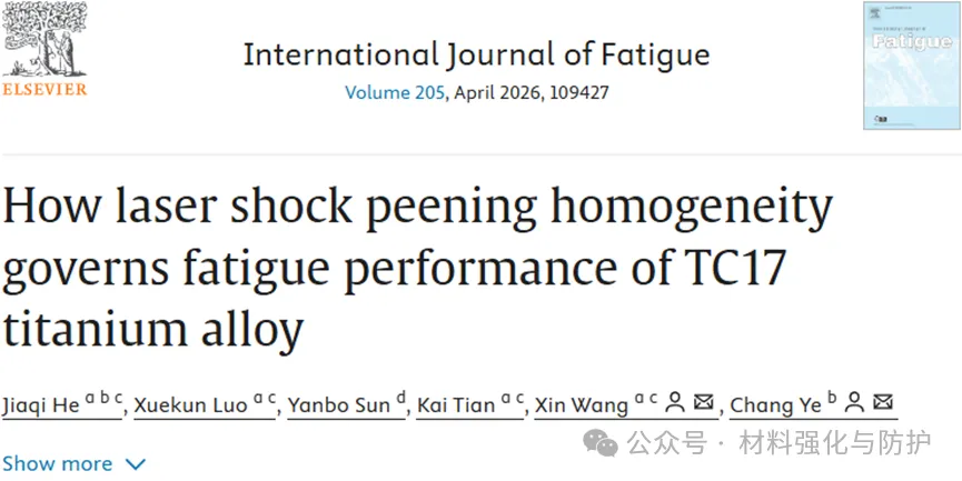 近日,中国航发北京航空材料研究院等单位研究人员针对不均匀激光冲击喷丸(LSP)引起的疲劳寿命下降问题,对TC17钛合金进行了不同扫描方式的LSP处理,以改善表面完整性,特别是改善了合金表面的均匀性。相关结果以“How laser shock peening homogeneity governs fatigue performance of TC17 titanium alloy”为题被发表在期刊《International Journal of Fatigue》上。