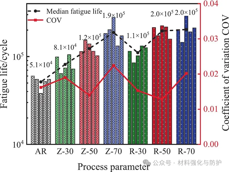 表面完整性幅值提升可有效抑制疲劳裂纹萌生与扩展,推动裂纹形核位点从表面向亚表面迁移,降低裂纹扩展速率。表面完整性均匀性提升可减少局部应力集中区域,降低裂纹萌生效风险,显著减小疲劳寿命离散性。均匀性与幅值存在协同作用,良好的均匀性可弥补低表面完整性幅值的不利影响,提升合金疲劳耐久性。