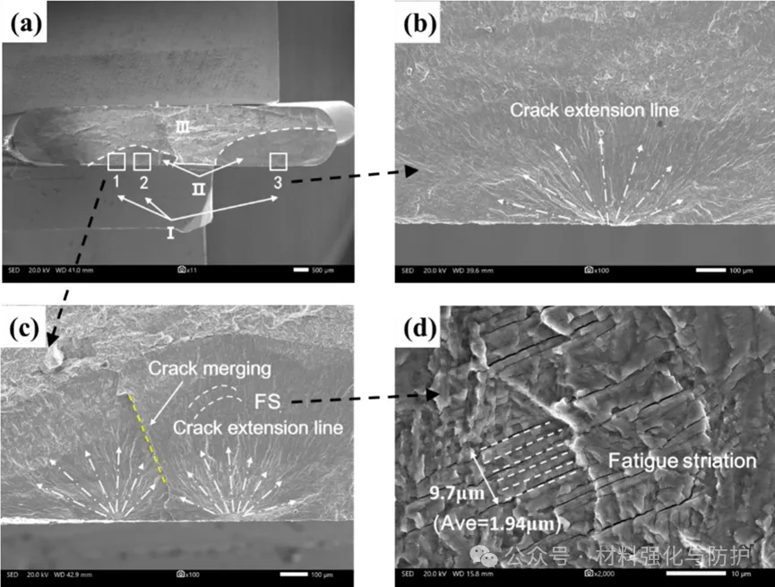 随LSP重叠率升高,疲劳裂纹形核位点数量减少且向亚表面迁移,疲劳辉纹宽度变窄,裂纹扩展速率降低。相同重叠率下,旋转扫描试样均为单一形核位点,之字形扫描存在多形核位点,证实均匀性是影响裂纹萌生源的关键因素。
