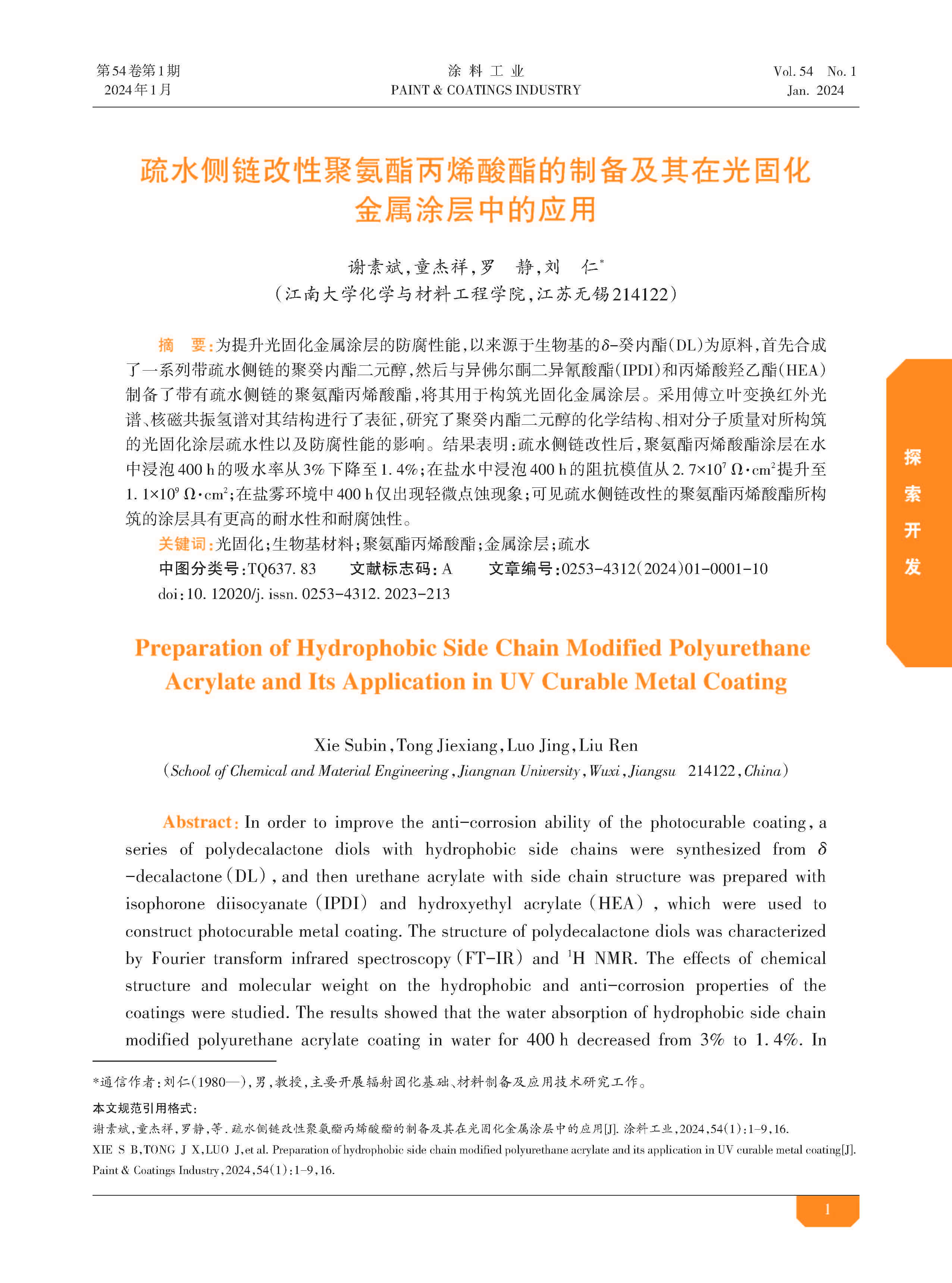 疏水侧链改性聚氨酯丙烯酸酯的制备及其在光固化金属涂层中的应用