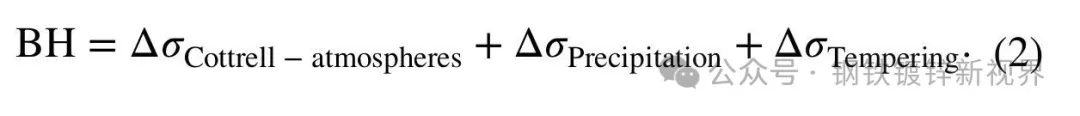 据报道,在预应变和烘烤的DP钢样品中观察到相当大的烘烤硬化效应。在烘烤过程中,必须同时考虑铁素体中的几种机制和马氏体中的几种机制:铁素体中可动位错附近的柯垂尔气团形成、铁素体中的碳团簇和碳化物析出,以及马氏体回火效应,如体积收缩、强度改变以及在铁素体/马氏体界面附近额外的碳团簇或析出。因此,DP钢的烘烤硬化效应可以用公式(2)表示。