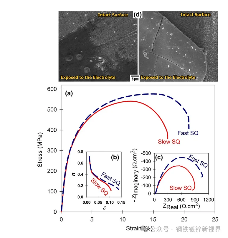 图5 快SQ和慢SQ处理对普通结构钢钢级(DIN 17100,St37钢)影响的比较:a 拉伸工程应力-应变曲线,b 瞬时加工硬化指数,c 耐腐蚀性,以及 d 快SQ(左)和慢SQ(右)样品的腐蚀表面