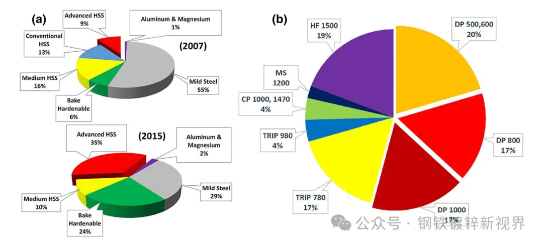 图1 a 金属合金和 b AHSS在汽车车身中的使用情况