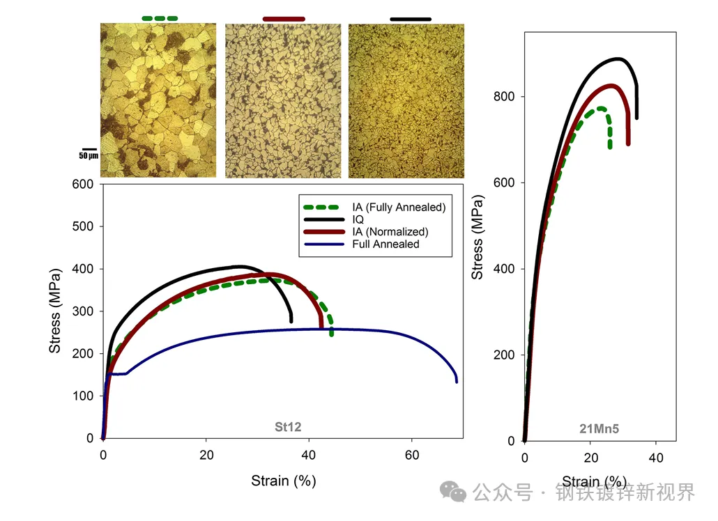 IA路线可以应用于完全退火和正火的显微组织。后者产生具有均匀分布马氏体岛的细晶组织,而前者的初始显微组织导致具有粗晶铁素体和带状马氏体形态的DP显微组织,如图4所示。该图还表明,在所研究的St12钢(DIN 1623, 0.035C–0.268Mn–0.035Si, wt%)[20]和21Mn5钢(DIN 17115, 0.18C–1.29Mn–0.14Si–0.022Cu–0.083Ni, wt%)[21]中,IQ路线产生了更细的显微组织以及随之增强的拉伸性能。应当注意,所用的St12钢含碳量低于0.10 wt%,锰含量高达0.4 wt%,被认为是一种用于汽车车身面板、马口铁和线材产品的高成形性扁平轧制产品。此外,21Mn5钢含有0.18–0.24 wt% C和1.1–1.6 wt% Mn,具有适合DP钢加工的化学成分和淬透性。