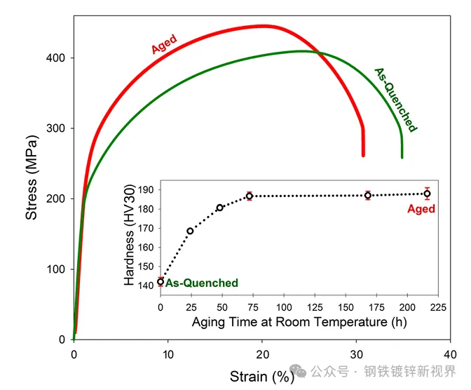 一些DP钢在室温下的自然时效导致强度提高。事实上,铁素体相的淬火时效可能通过碳化物颗粒的形成在室温下发生。DP样品淬火时效后硬度的演变如图16a所示。可以看出,硬度值随时效时间持续增加,并在特定时间达到最大值。淬火时效对DP样品拉伸应力-应变曲线的影响如图16b所示,其中观察到屈服强度和抗拉强度增加。此外,注意到时效效应对淬火温度的强烈依赖性,这与铁素体中固溶碳含量的变化有关。发现DP钢的晶粒细化对增强淬火时效效应非常有效,其中由于析出细小碳化物而产生的沉淀强化效应可以用Ashby-Orowan关系和Hall-Petch关系来描述。冷轧和淬火时效的结合已被证明是提高DP钢拉伸性能的有效途径。对于硅含量极低的钢,已报道了强烈的淬火时效效应。不溶于碳化物但溶于铁素体的合金元素,如Si、Al和P,可能对铁素体中碳化物的生长速率有非常大的影响。在生长颗粒周围硅的富集导致该区域碳的活度增加,从而减少了碳向颗粒的扩散通量并降低了析出速率。