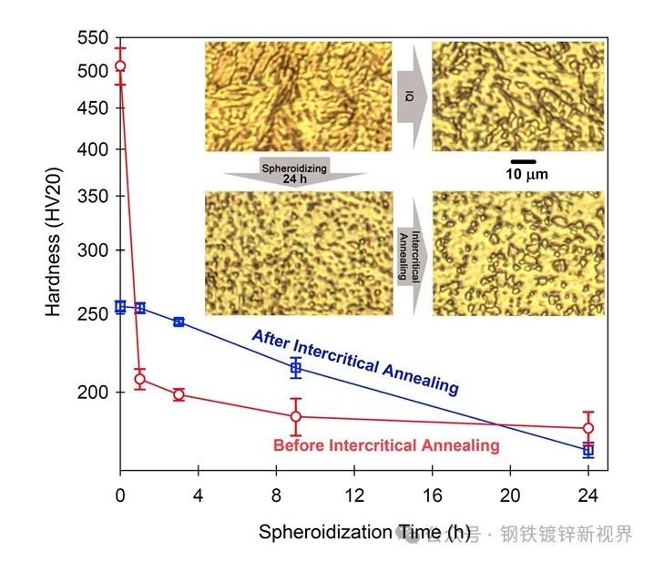 球化热处理对低碳钢和DP钢显微组织和硬度的影响如图13所示。可以看出,随着球化时间的增加,具有初始马氏体显微组织的样品由于回火效应硬度下降。随后经过临界区退火的相应DP样品由于存在马氏体而显示出更高的硬度值。然而,随着预球化时间的增加,DP钢的硬度基本下降,这与获得离散岛状马氏体颗粒的倾向增加有关。尽管如此,这种方法能够改变DP样品中马氏体颗粒的形貌和分布,如图13中的显微组织所示。