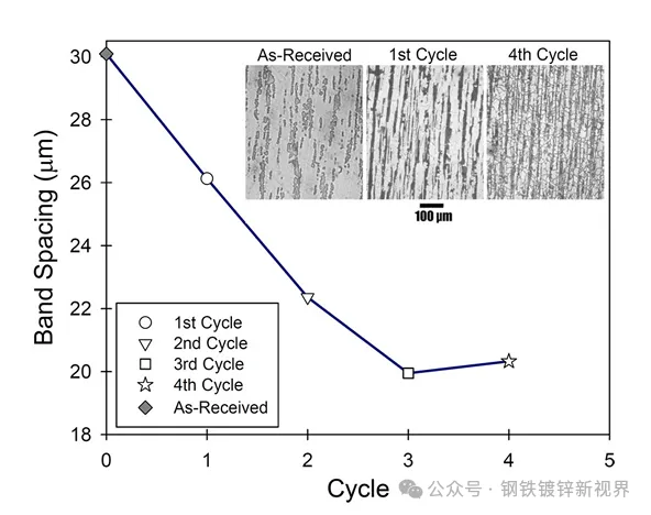 热循环是另一种细化DP钢显微组织的方法。其在细化DP钢中带状组织方面的应用如图14所示。通过增加临界区退火循环次数,DP钢样品中的带状间距显著减小直至达到饱和值。力学性能的研究证明了这种简单热处理路线用于DP钢显微组织调整的潜力。一种新颖的多步临界区热处理,用于在先进高强度钢中诱导具有超低屈强比和高塑性的多相显微组织也已被描述。已提出一种两步临界区退火和临界区回火热处理用于提升低碳合金钢的强度-塑性平衡,其中加工后钢的显微组织包含临界区板条状铁素体、贝氏体/马氏体板条和针状残余奥氏体。对冷轧铁素体-珠光体组织进行临界区退火,随后在较低温度下进行短时临界区退火,已被用于提高DP钢的塑性,其显微组织由铁素体基体中的链状网状马氏体组成,且具有超细和粗晶两种结构。