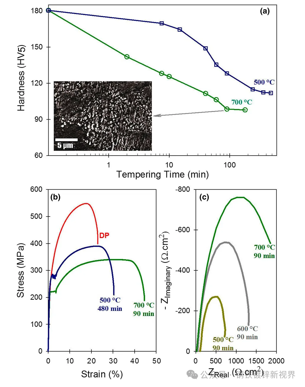 图15 回火过程的时间和温度对DP钢 a 硬度、b 工程应力-应变曲线和 c 腐蚀行为(以奈奎斯特图表示)的影响