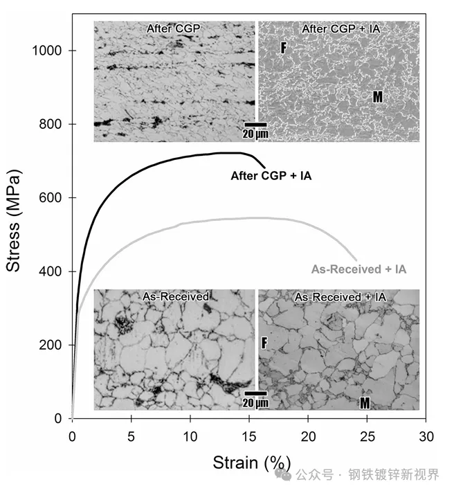 图12 CGP工艺对DP钢显微组织和工程应力-应变曲线的影响