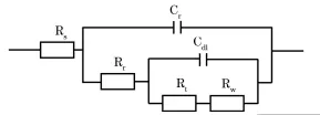 由图6可见:带氧化铁皮试样的半圆半径远大于无氧化铁皮试样。由于此时试样尚未进行盐雾腐蚀试验,因此没有锈层,可将氧化铁皮视为电阻和电容并联。采用图7所示等效电路拟合电化学阻抗谱,其中Rs为溶液电阻,C电容,Rct是界面转移电阻,拟合结果见表2。由于氧化铁皮中含有孔隙和裂纹等缺陷,其电阻虽然比无氧化铁皮试样更大,但还未达到绝缘的程度。