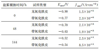 由图5和表1可见:带氧化铁皮试样的腐蚀电流密度较小,表明氧化铁皮可以保护基体。随着盐雾腐蚀时间的延长,有无氧化铁皮试样的极化曲线均向正方向移动,这说明腐蚀一段时间后两组试样的腐蚀电位均变正,腐蚀倾向变小,但腐蚀电流密度变大。然而,带氧化铁皮试样经过144h盐雾腐蚀后,腐蚀电位却变为负值,这表明氧化铁皮的阻滞作用经过长时间的腐蚀已经消失,此时氧化铁皮起到促进基体腐蚀的作用。