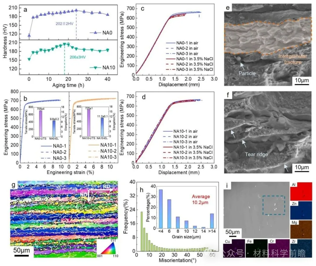 微观组织和力学性能 自然时效预处理加速了峰时效响应,将峰时效时间从24h缩短至18h(图1(a)),同时峰值硬度从202HV提高至206HV,抗拉强度从705MPa提高至725MPa,塑性从9.8%提高至11.2%(图1(b)),表明强度和塑性的同时改善。最重要的是,相比NA0样品,NA10样品的应力腐蚀敏感因子从25.0%降低至10.7%,应力腐蚀抗力和强度得到同步提升。断口分析表明,NA0样品表现出明显的沿晶断裂形貌(图1(e)),相比之下,NA10样品的韧窝和撕裂棱特征显著增加,表明自然时效预处理减轻了应力腐蚀裂纹沿晶界的扩展。 图1 NA0和NA10样品的力学性能和微观组织表征:(a)硬度随人工时效时间的变化;(b)峰时效状态下NA0和NA10样品的工程应力-应变曲线;(c)和(d)分别为峰时效状态下 NA0和NA10样品的慢应变速率拉伸试验结果;(e)和(f)分别为应力腐蚀测试后NA0何NA10样品的断口形貌;(g)固溶处理后的EBSD图;(h)固溶处理后合金的晶粒尺寸和晶界特征分布;(i)固溶处理后微米级第二相的形貌和EDS分析。
