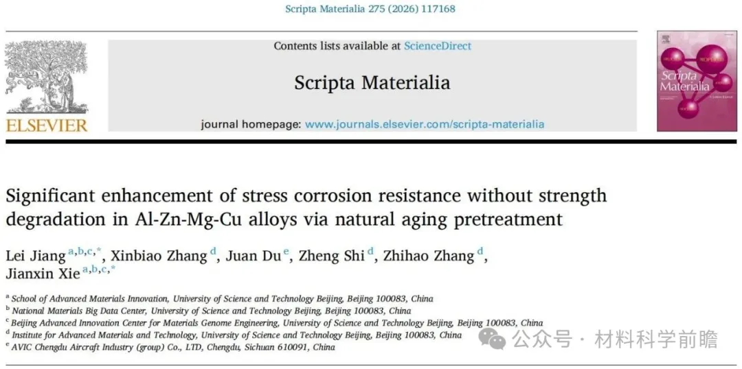 文章标题:Significant enhancement of stress corrosion resistance without strength degradation in Al-Zn-Mg-Cu alloys via natural aging pretreatment 发表期刊:Scripta Materialia 通讯作者及单位:谢建新/姜磊-北京科技大学 一作:姜磊-北京科技大学 文章概览 化学成分:Al-10.2Zn-2.32Mg-1.35Cu-0.1Cr-0.1Zr wt.% 热处理工艺:固溶处理(50min @450℃+100min @480℃)+自然时效预处理(10天@25℃)+人工时效(@120℃) 微观组织特征:晶界偏聚减轻,无析出区域宽度减小,晶内形成更细、更弥散、数量密度更高的析出物 抗应力腐蚀性能:峰时效状态下应力腐蚀敏感因子降低超过50%(10% vs 无自然时效预处理的25%) 核心创新点 通过适当自然时效预处理实现的析出相调控策略: 1) 通过适当时间的自然时效预处理,晶界处元素偏聚程度减轻,晶界附近无析出区域宽度减小,最小化晶界和晶内的微观组织差异,从而降低沿晶开裂风险; 2) 晶界元素偏聚减轻反过来促进晶内形成更加细小、弥散和更高数量密度的析出,从而保持甚至提高抗拉强度,实现抗拉强度-应力腐蚀抗力协同提高。 研究成果 材料和热处理工艺 本文研究的铝合金成分为Al-10.2Zn-2.32Mg-1.35Cu-0.1Cr-0.1Zr wt.%,试样在 450℃下固溶处理50min,随后在480 ℃下处理100min,然后水淬。随后,在室温(25℃)下进行10天的自然时效预处理,再进行120℃的人工时效,样品被称为 NA10。作为对比,固溶处理后立即在120℃下进行人工时效的试样称为NA0。