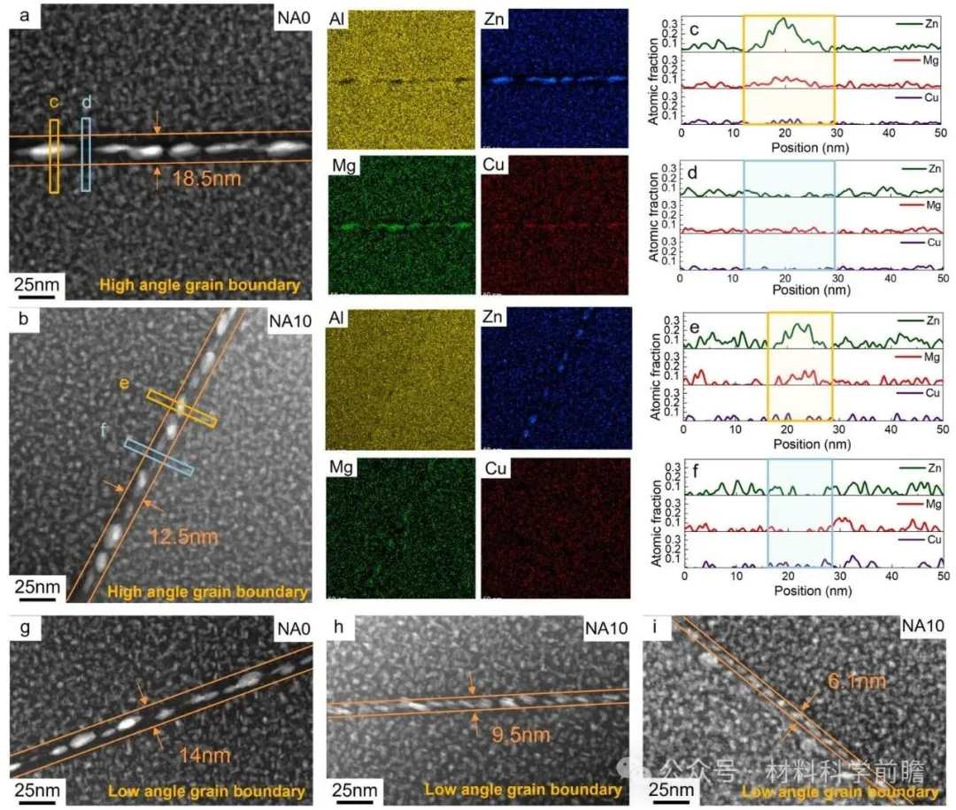 强度-应力腐蚀抗力协同提升机理 晶界析出特征改变提高应力腐蚀抗力:两种样品的高角度晶界特征分别如图2(a)和(b)所示,可见NA0和NA10样品的晶界影响区分别为18.5nm和12.5nm。EDS分析表明,Zn、Mg元素在NA0样品的晶界处显著富集(最大浓度:~37at.%(Zn),~12at.%(Mg)),并伴随着析出物周围的溶质贫化(图2(c, d))。相比之下,NA10样品晶界析出物内部的Zn富集程度(~27at.%)显著降低,Mg富集(~16at.%)增加(图2(e, f)),同时基本未检测到无析出区。这种Mg/Zn比的升高从热力学上有利于晶界析出物从η相向T相转变,从而有助于增强应力腐蚀抗力。两种样品的低角度晶界特征对比与上述结果相似,如图2(g-i)所示。 图2 NA0和NA10样品晶界析出物分析:(a)和(b)分别为峰时效下NA0和NA10样品的高角度晶界形貌和EDS分析;(c)和(d)分别为NA0样品晶界析出物和溶质贫化区的EDS线扫结果;(e)和(f)分别为NA10样品晶界析出物和溶质贫化区的EDS线扫结果;(g-i)为NA0和NA10样品的低角度晶界形貌。