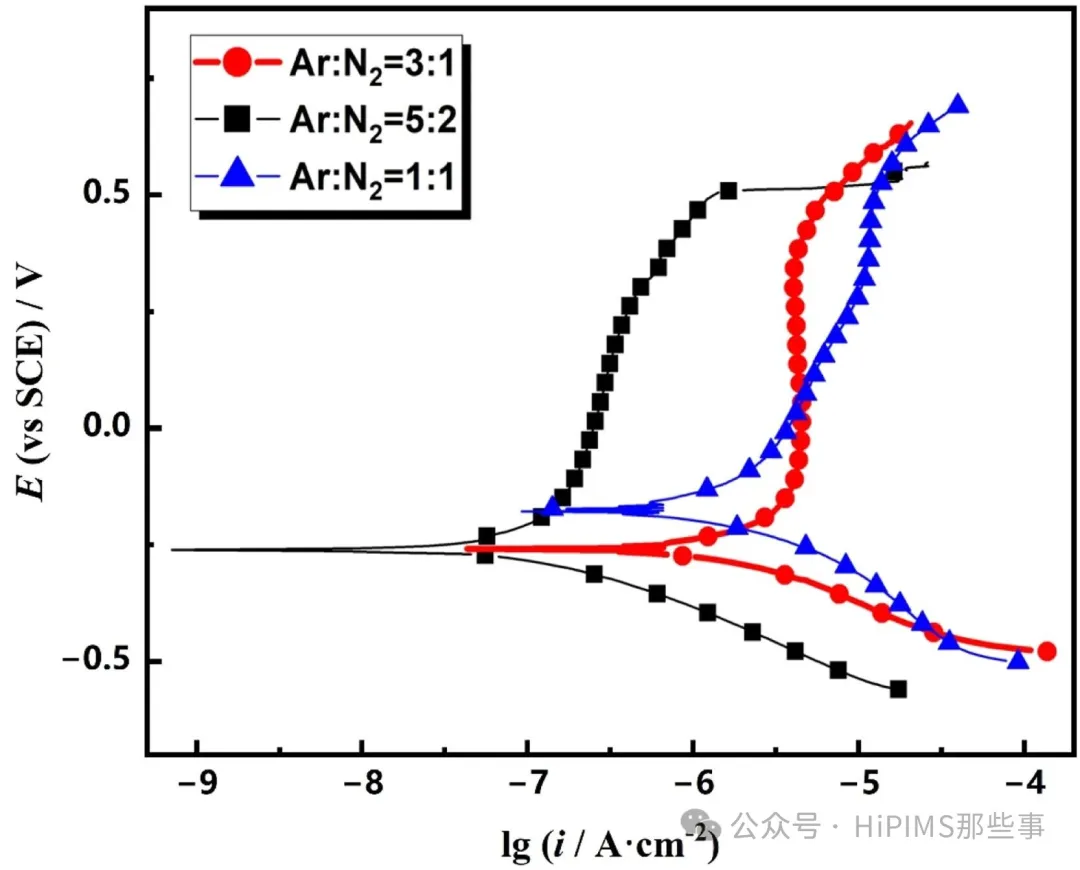 图7. 在人工海水中,不同Ar:N₂比例的CrₓN涂层的动电位极化曲线。