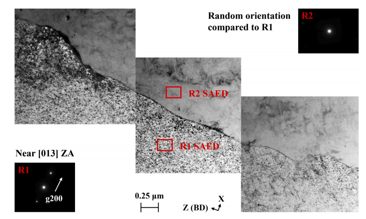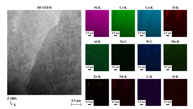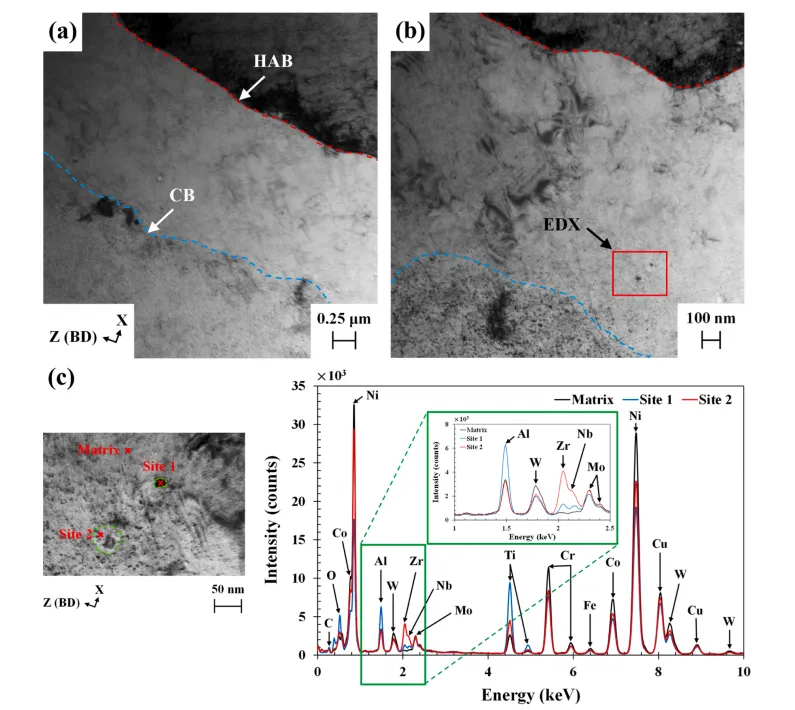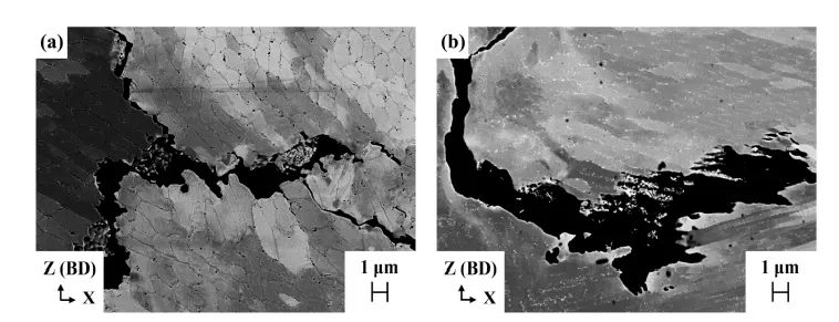 图1. (a) 用于制备 R65 和 R108 薄壁构件的激光粉末床熔融工艺参数。(b) 基板上薄壁零件的三维计算机辅助设计图。 采用 Aconity™ MIDI 激光 3D 打印机,在不同成型基板上分别制备了两种合金的薄壁试样(每种合金各 1 件),成型工艺参数如图 1a 所示。图 1b 为成型基板上薄壁试样的三维计算机辅助设计(CAD)示意图。打印采用双向扫描策略,扫描方向与试样壁厚方向(沿 X 轴)呈 15° 夹角;试样摆放方向与铺粉方向呈 45°,以避免打印方向与铺粉器运动方向垂直。 图2. (a) R108 合金的扫描电镜图像,插图(绿色框)显示微裂纹附近用于聚焦离子束制样的目标区域(红色框,ROI)。(b) 聚焦离子束制样后,薄试样 XZ 面的透射电镜 / 扫描透射电镜表征区域示意图。注:Z 方向与成形方向(BD)一致。 为观察包含成型方向(BD)的 XZ 平面显微组织,采用配备牛津 Xplore 透射电镜 X 射线能谱(EDX)探测器的日本电子 JEM 2100F 场发射透射电子显微镜开展测试,在 200 kV 工作电压下分别以常规透射电镜模式和扫描透射电镜(STEM)模式进行分析。同时采用可控倾转技术和选区电子衍射(SAED)花样,对显微组织中的不同区域进行区分,并识别 γ' 析出相。 图3. (a) 镓离子束成像图,含微裂纹尖端前方的大角度晶界(深蓝色虚线),红色矩形标注出目标原子探针层析成像区域。(b) 环形铣切制样装置示意图,聚焦离子束制样薄片通过铂焊接固定在硅柱上。(c) 经环形铣切得到的针状试样形貌,大角度晶界位于试样尖端。(d) R65、(e) R108 的透射菊池衍射大角度晶界识别图谱 为保证成分定量分析的可重复性,利用配备镓离子源的赛默飞世尔 Helios 5 UC 聚焦离子束仪,在每种合金的微裂纹尖端前方确定两个目标大角度晶界;通过赛默飞世尔 Helios G4 双束等离子体聚焦离子束仪完成标准的试样提取操作,将提取的试样薄片固定在磨尖的钨丝上,手动旋转 90° 使大角度晶界呈水平状态,随后将其置于法国 CAMECA 公司预制的硅微尖试样座上。再将试样薄片切割成独立小段,通过铂焊接固定在硅柱上。 图4.成形态 R65 和 R108 薄壁构件相关表征曲线:(a) 裂纹总面积占比与裂纹数密度;(b) 裂纹平均长度与平均宽度;(c) 不同偏心率下的裂纹面积占比分布。偏心率值越接近 0,裂纹形态越圆润;偏心率值越接近 1,裂纹形态越平直。 从 R65 到 R108,随合金成分变化,两种合金的裂纹面积分数和裂纹数密度均呈上升趋势。R108 合金裂纹面积分数的波动幅度较大(图 4a),这一现象归因于不同层面的微裂纹倾向存在差异。图 4c 为 R65 和 R108 合金的裂纹面积分数随微裂纹偏心率的分布规律。两种合金的裂纹面积分数分布特征相似,且微裂纹倾向均随偏心率增大而升高。但在所有偏心率区间内,R108 合金的裂纹面积分数均更高,且波动幅度更大。 图5. 250 倍二次电子扫描电镜(SE-SEM)图像:(a) 成形态 R65、(b) 成形态 R108 的微观组织。微裂纹按低偏心率(黑色标注)、高偏心率(红色标注)区分标识。 图 5 为 R65 合金(图 5a)和 R108 合金的 250 倍低倍二次电子扫描电镜(SE-SEM)显微照片(图 5b)。两种合金中均同时存在高偏心率微裂纹与低偏心率微裂纹。高偏心率微裂纹出现频次更高,形貌更平直,且沿成型方向分布;低偏心率微裂纹出现频次更低,形貌更呈锯齿状(拉链状),且沿熔池边界分布。 图6. 5000 倍背散射电子扫描电镜(BSE-SEM)显微图像:(a) R65、(b) R108 中高偏心率微裂纹典型形貌,其偏心率值介于 0.99 至 1 之间。 图 6 为高偏心率微裂纹的 5000 倍高倍背散射电子扫描电镜(BSE-SEM)显微照片。R65 合金(图 6a)和 R108 合金(图 6b)的微裂纹均沿成型方向分布,裂纹表面呈现枝晶状形貌;与 R65 合金相比,R108 合金枝晶间区域存在更多细小的球形颗粒。两种合金的裂纹边界处均未观察到颗粒聚集现象。 图7. 电子背散射衍射取向分布图:(a) 成形态 R65 中高偏心率微裂纹、(b) 成形态 R65 中低偏心率微裂纹的晶间取向差分布。 图 7a 为两种合金含两条平直(高偏心率)微裂纹区域的电子背散射衍射(EBSD)取向差分布图。该图显示,平直微裂纹沿取向差角大于 15° 的大角度晶界扩展,这类晶界是微裂纹的优先扩展路径。 图8. 5000 倍背散射电子扫描电镜(BSE-SEM)显微图像:(a) R65、(b) R108 中低偏心率微裂纹典型形貌,其偏心率值小于 0.99。 图 8 为低偏心率微裂纹的 5000 倍背散射电子扫描电镜(BSE-SEM)显微照片。R65 合金(图 8a)和 R108 合金(图 8b)的微裂纹均沿熔池边界分布,裂纹表面均呈现枝晶状形貌。R108 合金中的细小胞间颗粒较 R65 合金更为明显,且两种合金的裂纹边界处均未观察到颗粒聚集现象。 图9. 透射电镜图像展示平行于成形方向的 R65 胞状微观组织:(a) 5000 倍、(b) 10000 倍。(c) 对 (b) 中红色方形区域的能谱分析结果,呈现晶胞边界附近部分析出相的成分。 图 9a 为 R65 合金的典型透射电镜图像,可见柱状枝晶(胞状晶)。借助选区电子衍射花样可区分胞晶界与大角度晶界(见图 10)。高倍观察发现,胞晶界附近存在少量极细的球状颗粒。成分分析结果表明,该类颗粒富含铝、钛、锆、铌、碳、氧元素,而镍、铬、钨、钴、铁等基体强化元素含量偏低(图 9c)。由于碳、硼的原子序数低且含量微少,其信号易被其他基体元素吸收,因此在扫描透射电镜 X 射线能谱分析中未检测到这两种元素。 图10. 拼接透射电镜图像:展示 R65 合金微裂纹附近平行于成形方向的大角度晶界,附区域 1(R1)和区域 2(R2)的选区电子衍射花样