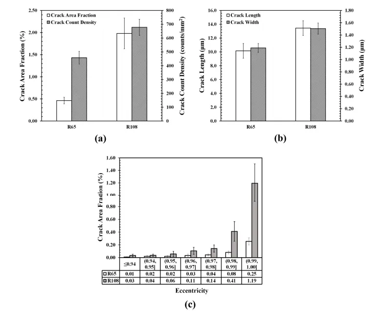 本文探究了激光粉末床熔融成形的的不同成分高 γ' 相镍基高温合金的微裂纹形成机制,选取了两种含不同含量 γ' 相形成元素(钛、铝、钽、铌)与晶界强化元素(硼、碳、锆、铪)的合金开展研究。RENÉ 65 合金(R65)主要含钛、铝、铌、硼、碳和锆,而 RENÉ 108 合金(R108)主要含钽、铝、硼、碳和铪。R108 的微裂纹密度较 R65 高出 329%,且两种合金的裂纹面积分数随偏心率的分布规律相近。所有微裂纹均在大角度晶界处萌生,且呈现枝晶间形貌特征,表明其微裂纹形成机制为凝固裂纹。研究利用高分辨率透射电镜成像开展了元素分析,结果显示,与 R65 相比,R108 的胞间存在更多碳化物、氧化物等细小离散析出相;其中 R108 的碳化物富含铪 / 钛 / 钽,而 R65 的碳化物则富含铌 / 钛。但两种合金的大角度晶界处几乎无碳氧化物存在,且未观察到可辨识的低熔点相和 γ' 相颗粒,因此第二相对该类高温合金的凝固裂纹形成无影响。研究发现,合金的凝固区间与裂纹敏感性存在强相关性。热力学模拟结果表明,R108 的溶质偏聚倾向更高,不仅扩大了合金的凝固区间,还使其在凝固末期的低温阶段仍保持更高的液相体积分数。Scheil-Gulliver 模型计算显示,R65 与 R108 的凝固区间差值最高可达 72℃,这使得 R108 的凝固裂纹敏感性指数较 R65 降低 91%,也解释了 R108 的微裂纹倾向显著更高的实验现象。