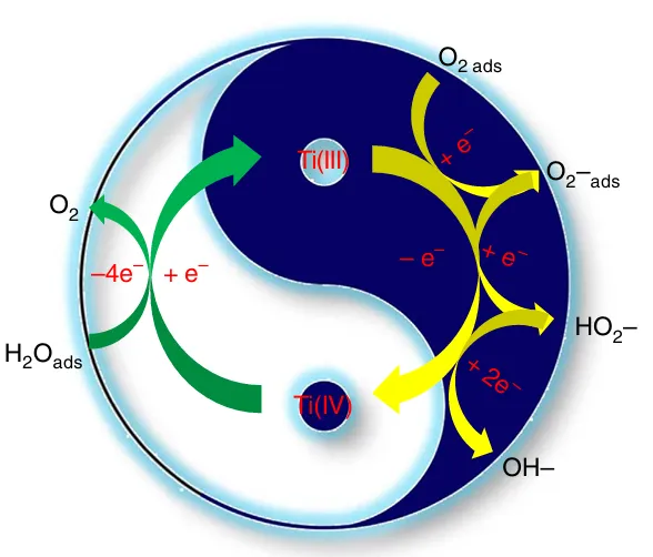 图4. TiO2-x表面缺陷/氧空位与O2/ORR活化关联示意图。DOI: 10.1038/ncomms9696。
