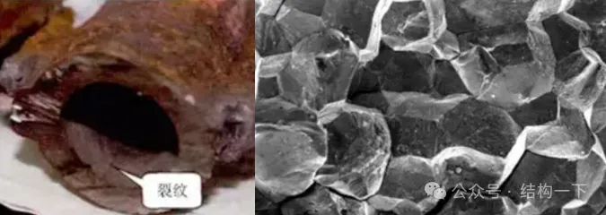 使用扫描电子显微镜观察断口。韧窝表明是韧性过载断裂;疲劳辉纹是疲劳断裂的铁证;冰糖状形貌则表明沿晶脆断; 冰糖”状沿晶 + 腐蚀产物 是应力腐蚀(腐蚀断); “冰糖”状沿晶 + 无腐蚀产物 + 高强度钢是氢脆(氢脆断)。