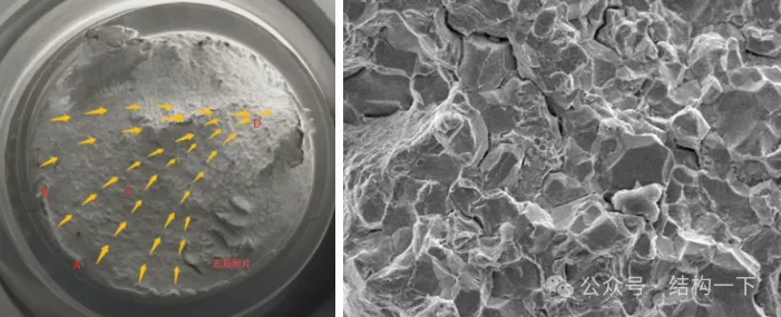 01 |常见的断裂原因 1. 过载断裂 当部件承受的应力超过其抗拉强度时,就会发生过载断裂。 特征:通常有明显的宏观塑性变形(如缩颈),断口呈杯锥状(韧性材料)或较平整(脆性材料)。韧性断口呈暗灰色纤维状,脆性断口则有闪烁光泽。 常见原因:设计强度不足、实际载荷超标或材料强度过低。 同个材料出现两种锻炼,断面A较为平整,故A为初始锻炼位置。 2. 疲劳断裂 这是最常见的断裂形式(占比约80%-90%),由循环交变应力长期作用引起。 特征:断裂是突然发生的,无明显塑性变形。典型断口上有疲劳源区(光滑细密)、疲劳扩展区(常呈现贝壳纹或海滩花样)和瞬断区(粗糙晶粒状)。 常见原因:存在应力集中(如尖角、缺口)、频繁起停或振动,或材料本身疲劳强度不足。 3. 应力腐蚀开裂(SCC) 特征:裂纹形态既有腐蚀特征(如充满腐蚀产物),又有机械断裂特征。主裂纹常有许多分支,呈树枝状。宏观断口较脆,颜色灰暗。 常见原因:材料与所处介质不匹配(如奥氏体不锈钢在含氯离子环境中)、焊接或加工残余应力过大。 4. 氢脆 氢原子进入金属内部导致韧性下降,引起的脆性断裂。 特征:断裂延迟,即在受力后经过一段时间才突然断裂。断口平齐,微观上常呈现沿晶断裂或鸡爪状形态。 常见原因:电镀(如镀锌、镀镉)过程中渗氢、在含氢环境中使用,或焊接湿度过大。 5. 蠕变断裂 在高温环境下,即使应力低于屈服强度,材料也会随时间缓慢发生塑性变形,最终导致断裂。 特征:断裂前有大量塑性变形,断口附近常有许多微小裂纹(蠕变空洞)。宏观断口呈氧化色,表面粗糙。 常见原因:锅炉管道、涡轮叶片等长期在高温下服役。 6. 脆性断裂(解理断裂) 断裂前几乎不产生塑性变形,扩展速度极快,危险性高。 02 |如何分析断裂原因 宏观断口分析(最直观) 微观形貌分析 电镜是追溯裂纹路径的关键工具: 整体追踪:在低倍镜下,先找到断口上放射棱条或人字形花样的发散中心,那个收敛点就是裂纹源。 微观溯流:在高倍镜下,观察解理断裂中的“河流花样”。小支流汇入主流的方向,就是裂纹的局部扩展方向。 区域定位:通常,疲劳源区的断口因反复磨合而最平坦、最光亮;扩展区较平滑,常有疲劳辉纹;瞬断区则最粗糙。这种形貌差异也能辅助判断方 3.成分与金相分析 检查材料化学成分是否符合标准。同时,在断口旁制取金相试样,观察是否存在非金属夹杂物、表面脱碳层、晶粒粗大等微观缺陷。 4.力学性能测试 测试材料的强度、硬度、塑性等指标,并与设计标准进行对比。 5.综合分析 03 |电子显微镜微端断口 1. 韧窝 这是韧性断裂(过载)的典型标志。在电镜下,断口表面看起来像密密麻麻的微小凹坑,也就是微孔聚合的痕迹。 分析要点:韧窝大且深,说明材料塑性好、强度低;韧窝浅而小,则说明塑性较差。若韧窝沿一个方向被拉长,呈抛物线状,还能指示断裂时的剪切方向。 2. 疲劳辉纹 这是疲劳断裂在电镜下的“铁证”。在扩展区,能看到一系列相互平行、略带弯曲的微小条纹,每一条通常代表一次应力循环。 分析要点:发现疲劳辉纹,就可以直接判定为疲劳断裂。通过测量辉纹的间距,还能推算应力大小和扩展速率。需要注意的是,辉纹是微观的,必须用高倍电镜才能看到。 3. 解理特征与沿晶特征 这是脆性断裂的典型表现。 解理断裂:穿晶断裂,形似“河流”或“舌头”。断口平坦,有光泽。河流的汇聚方向,就指向裂纹源。 沿晶断裂:裂纹沿晶界扩展,形似“冰糖”或“岩石”。这通常意味着晶界弱化,可能是由应力腐蚀、氢脆或晶界析出相导致的。
