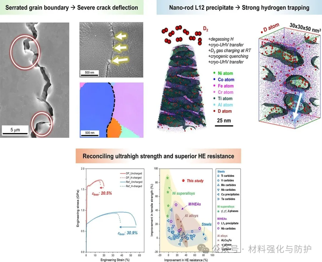 该研究团队独辟蹊径,利用了在传统观点中通常有害的不连续析出反应。他们设计了一种成分为Cr18Fe18Co28Ni28Al4Ti4的高熵合金(DP合金),并通过特定的直接时效工艺,在其内部构建了独特的“双功能”微观结构,该策略的核心在于,锯齿状晶界能强力偏转和阻碍氢致裂纹扩展,而L12纳米相本身则是高效的氢捕获陷阱,能显著抑制氢扩散,两者协同,突破了强度与氢脆抗性难以兼得的难题。
