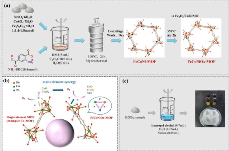 Fe/Co/Ni多元素协同作用:MOF基阳极催化剂!有效降低工业环境电解水OER过电位,缓解阳极腐蚀问题