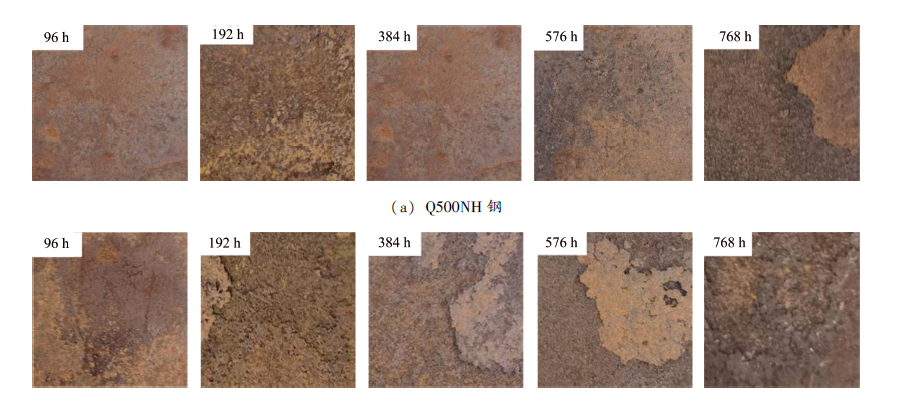 "本研究以Q500NH 耐候钢为研究对象,以Q355 钢为对比钢ꎬ通过室内干湿交替循..."