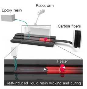 图2 特拉华大学研究人员设计的新型3D打印方法示意图。其中加热装置接触并沿着碳纤维移动,产生动态温度梯度,触发分配液体聚合物在碳纤维结构中注入并固化。(图片来源:特拉华大学)