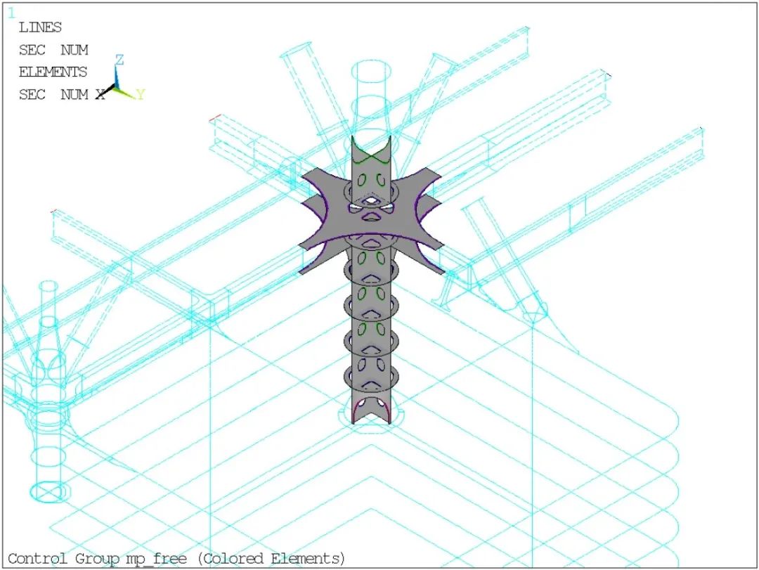 为使“深海一号”上部组块与船体连接更有力,采用了“大立柱嵌小立柱”的形式,在船体立柱的角点位置嵌入上部组块立柱的支撑柱,在支撑柱的内部设置“十字”交叉强框和多个水平环梁,在支撑柱顶部通过3米大的肘板,整个连接结构就像一束花,在最需要它的地方绽放,实现了板架结构与杆系结构的完美联结。使得支撑结构的疲劳寿命能够达到150年以上。