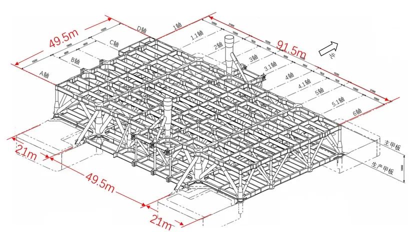 在权衡设备布置与结构匹配、主梁次梁布置匀称后,规划出了斜撑角度均为45°的近乎完美状态,勾勒出了“深海一号”能源站“六横四纵”的脊梁。