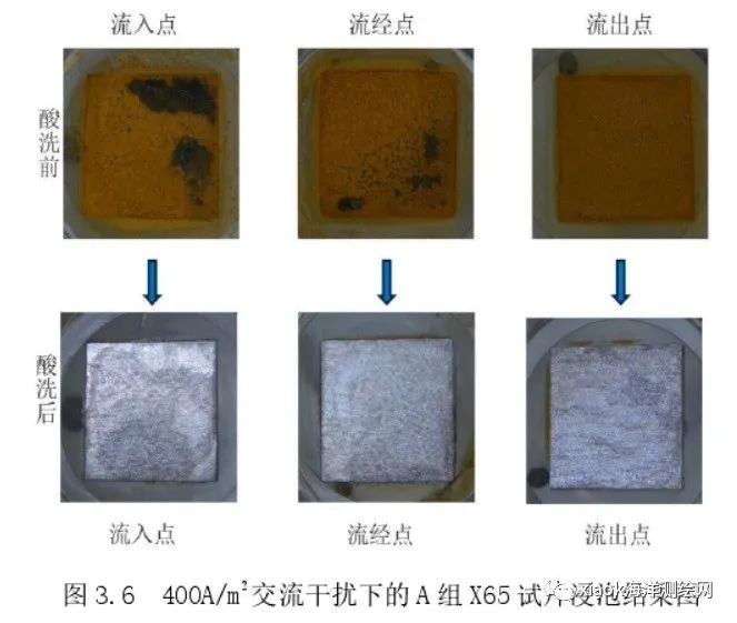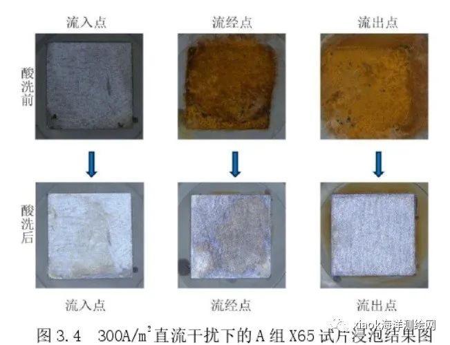 经过 20 天至 30 天,在 100A/m2到 300A/m2的直流电或者 400A/m2的交流电的持续作用下,X65 管线钢没有出现明显的点蚀现象;且 X65 材料的电流流入点、流经点、流出点的腐蚀规律明显(直流干扰下,流入点不发生腐蚀,流出点和流经点腐蚀明显;但是在交流干扰下,流入点也和流经点、流出点一样,腐蚀明显)。