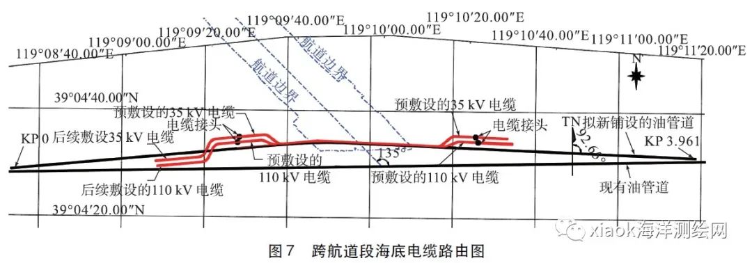 这篇文章讲的是这样的一件事情:新敷设的1 条110 kV 互联海底电缆和1 条平台间35 kV 海底电缆需要穿越港口航道。与此同时,该港口也要将航道扩建为25 万吨级,航道的设计长度约33. 7 km,设计宽度279 m,航道底标高-25. 6 m。拟扩建航道与1 条已建成投产的海底管道交叉,交叉部分管道需要做下沉改造处理。
