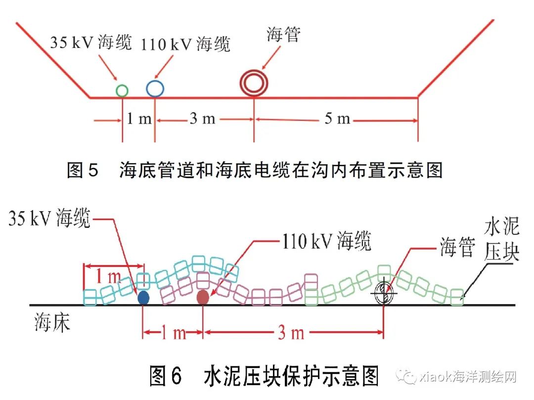 将1 根海底管道和2 根海底电缆共同敷设在预挖的10 m 宽管沟内,从南向北依次为海底管道、110 kV 海底电缆和35 kV 海底电缆。