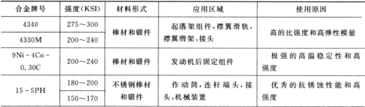一般来说,约有12%~16%的飞机基本结构是用合金钢(包括不锈钢)制作的。其最大的优点是具有高强度(见表2)和高弹性模量,其应用见表3。