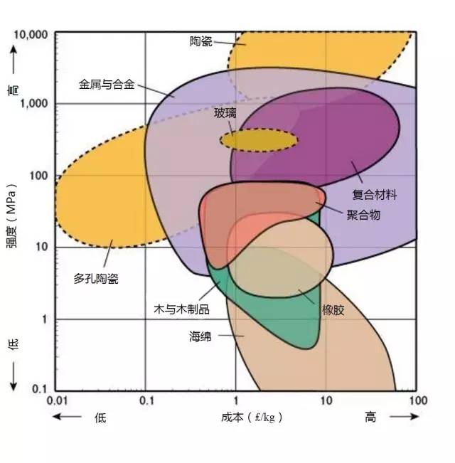 2.许多应用要求材料具有较高的强度,如螺丝刀、安全带等,但是他们通常都比较贵,只有极少数的材料能同时满足强度和成本的要求(左上部分)。