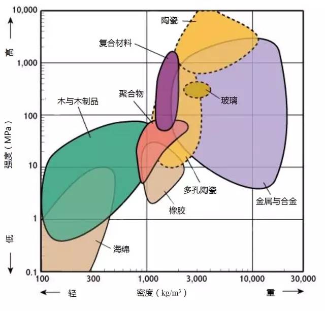 2.高强度且低密度的材料位于图形的左上部分。