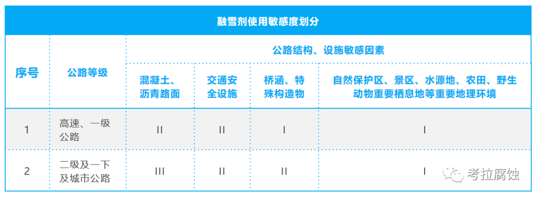DB65/T 4330-2021 公路融雪剂使用技术规范(地方标准:新疆) 根据施洒区域的环境敏感程度、公路结构及设施的敏感程度综合判定将施洒区域要求分为I级、II级、III级。(环境敏感区的划分参照生态环境部《建设项目环境影响评价分类管理名录》) I级:对钢筋混凝土构筑物、钢护栏等易受腐蚀部位,非氯化物类融雪剂单次使用量不超过本文件中融雪剂参考用量的低值。 II级:对钢筋混凝土构筑物、钢护栏等易受腐蚀部位,氯化物类融雪剂单次使用量不超过本文件中融雪剂参考用量的低值。 III级:对钢筋混凝土构筑物、钢护栏等易受腐蚀部位,融雪剂单次使用量不超过本文件中融雪剂参考用量的高值。 环保型融雪剂及复合型融雪剂的碳钢腐蚀速率宜 <0.08mm/a;