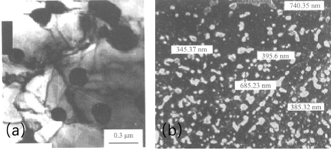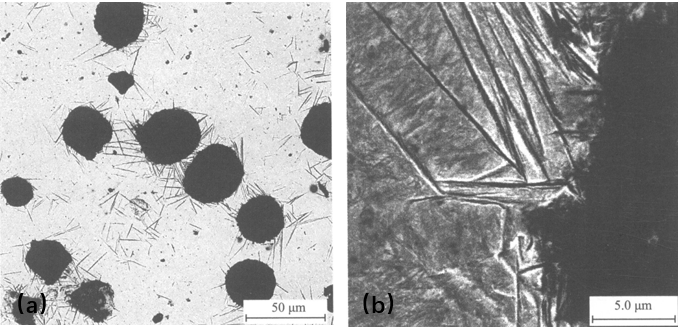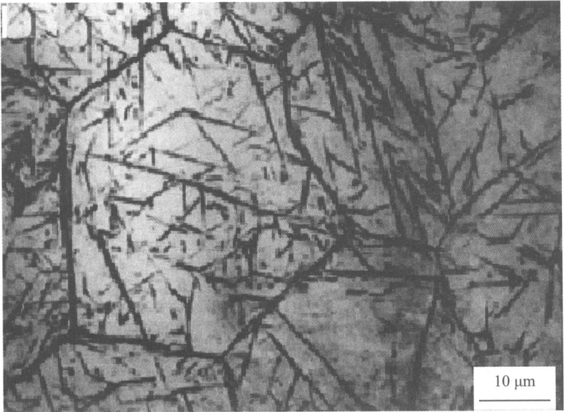 可见,在灰白色铁素体基体上分布着形状不规则的碳化物,有片状的,也有颗粒状的。图(b)所示为该钢的薄膜样品的透射电镜照片,可见,白亮色的(灰度近于 0%)是铁素体基体,碳化物呈黑色或灰黑色(灰度不等,有时在90%以上)的不规则片状。