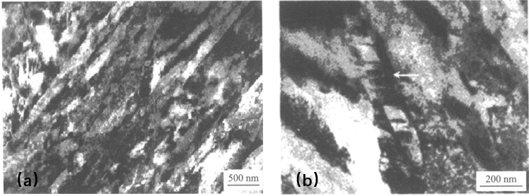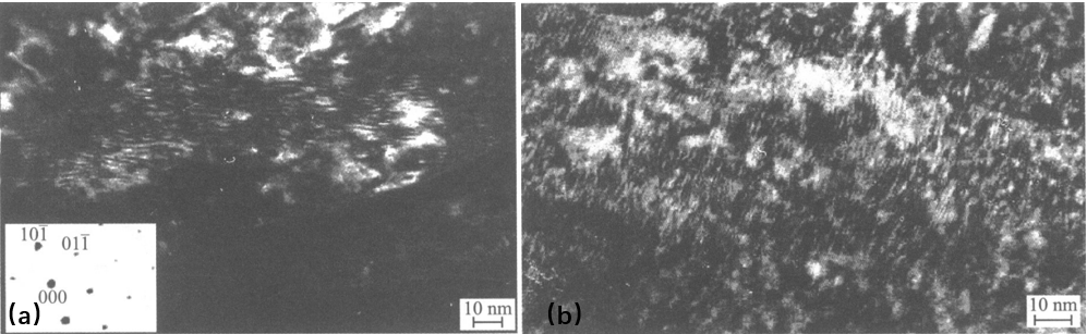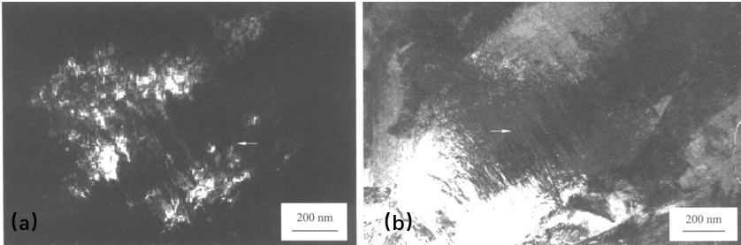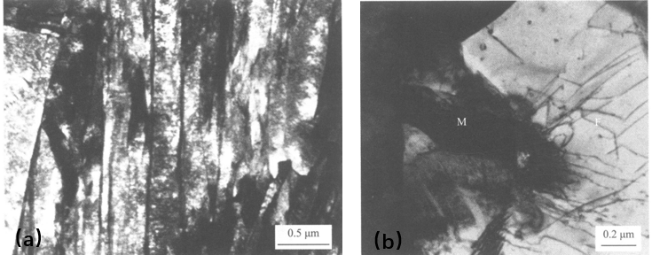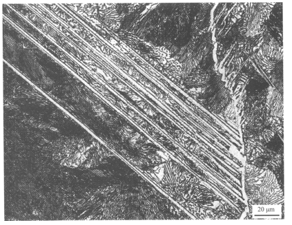 贝氏体中的孪晶不具备普遍性,只有在某些高碳高合金钢等材料中,在其下贝氏体组织中才可能观察到孪晶亚结构。一般来说,孪晶在300℃以上保温一段时间(相当于回火),孪晶会消失。因此, 在350℃以上得到的上贝氏体中没有观察到孪晶亚结构。