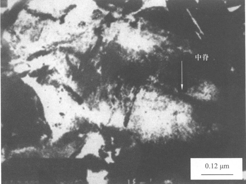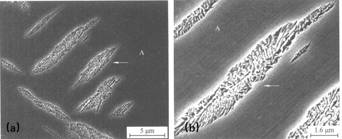 图17(a)所示为高碳钢(0.75%C,0.65%Mn,0.15%Si,0.39%Cr)的片状珠光体组织。在扫描电镜下可观察到渗碳体片层的立体形貌像,其照片是二次电子像,凹下部位呈灰黑色,较为凸出的部位是渗碳体,呈灰度很小的灰白色。图17(b)所示为Fe-2.6%Cr-0.96%C合金的珠光体组织的透射电镜照片,两相的灰度正好与图(a)相反,灰白色是铁素体片,黑色线条区域是渗碳体片。这是电子束衍射成像的结果。在电子束照射下,铁素体相符合布拉格衍射条件,呈白亮色,而渗碳体相不符合布拉格衍射条件呈黑色。