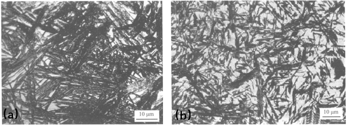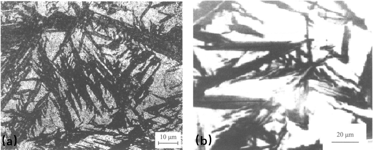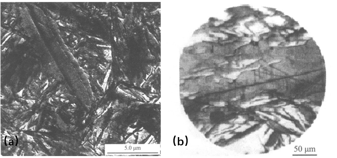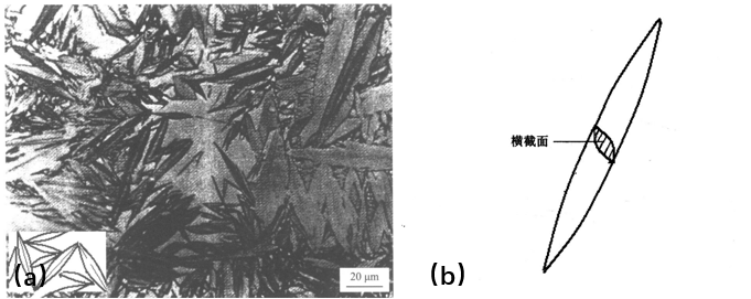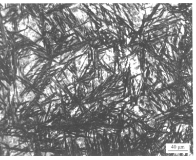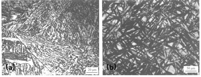 下贝氏体可在奥氏体晶界形核,有时也在晶内形核,具有片状或针状特征。 针状下贝氏体与片状马氏体相似,图4(a)所示为GCr15钢在 950℃加热奥氏体化,然后于300℃等温,采用光学显微镜观察到的针状(或片状)下贝氏体组织 ,酷似片状马氏体。图4(b)所示为低碳钢的渗碳层局部的淬火马氏体组织(自回火),可见,金相形貌非常相似,都有残留奥氏体(灰白色部分)。