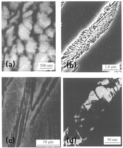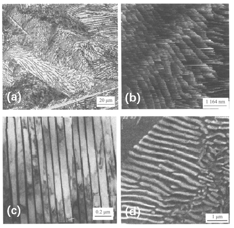 图28 高碳钢的片状珠光体组织:(a)钢轨钢的珠光体+先共析渗碳体组织(OM); (b)T8钢的片状珠光体表面浮凸(STM);(c)高碳钢 Fe-2.6%Cr-0.96%C的片状珠光体组织(TEM):(d)T8钢的片状佚光体+先共析铁素体表面浮凸(SEM)
