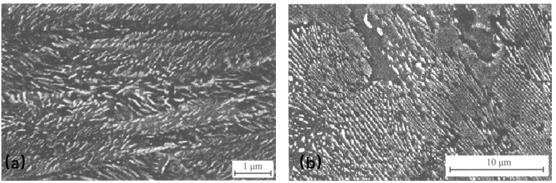图4 (a)GCr15钢的羽毛状上贝氏体组织 ;(b)共析钢的片状珠光 体组织(SEM)